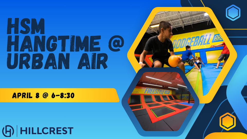 HSM Students! Who is ready to catch some killer hangtime?! Come invite a friend to join you show off your trampoline and bouncing skills as we head up to Urban Air in Madison! It is going to be an amazing night to do some flips, battle on the balance beam, play some trampoline dodgeball, and MORE! Make sure you bring some jump socks if you have them! Bus will pick us up at Hillcrest at 6PM!
